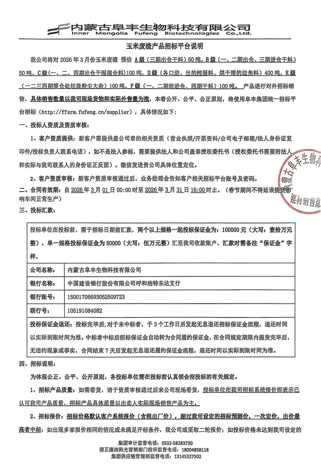 我公司将对2026年3月份玉米废渣预估A级(三期出仓干料)50吨,B级(一、二期出仓、三期进仓干料)50吨,C级(一、二、四期出仓干湿混合料)100吨,D级(各口进、出的纯湿料、烘干塔的边角料)400吨,E级(一二三四期筒仓处垃圾粉尘大杂)100吨,F级(一、二期前进仓、四期干料)100吨。 产品进行对外招标销售,具体销售数量以我司现场货物和实际外售量为准,本着公开、公平、公正原则,将使用阜丰集团统一招标平台招标(http://ffsrm.fufeng.cn/supplier),具体情况如下: