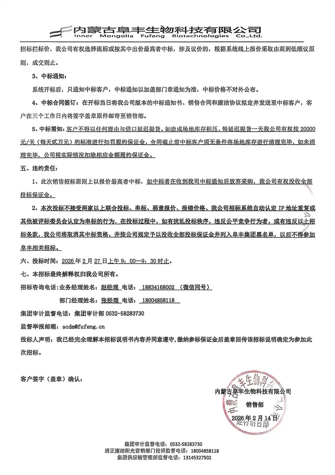 2、本次投标不接受两家以上联合投标、串标、恶意报价、报错价格、我公司招标系统自动认定IP地址重复或其他被评标委员会认定为串标的行为,在投标过程中,如有扰乱投标秩序,违反公平竞争行为者,或有违反以上招标条款,我公司将取消其中标资格,并按公司规定予以没收全部投标保证金并列入阜丰集团黑名单,以后不得参加阜丰相关招标。