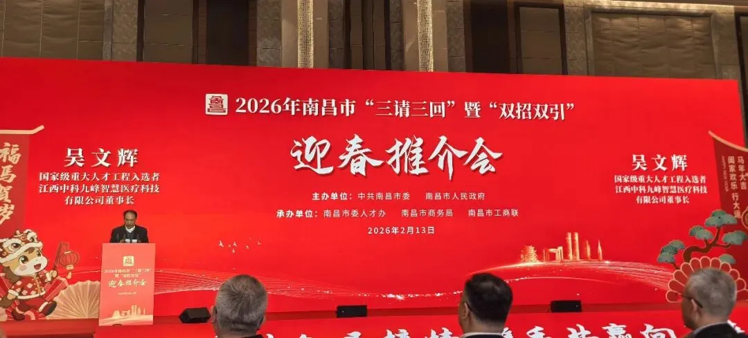 2026年2月13日,由南昌市委市政府主办的“三请三回”暨“双招双引”迎春推介会在南昌隆重举行。国家重大人才工程入选者、九峰医疗董事长吴文辉受邀参会并作重要发言。