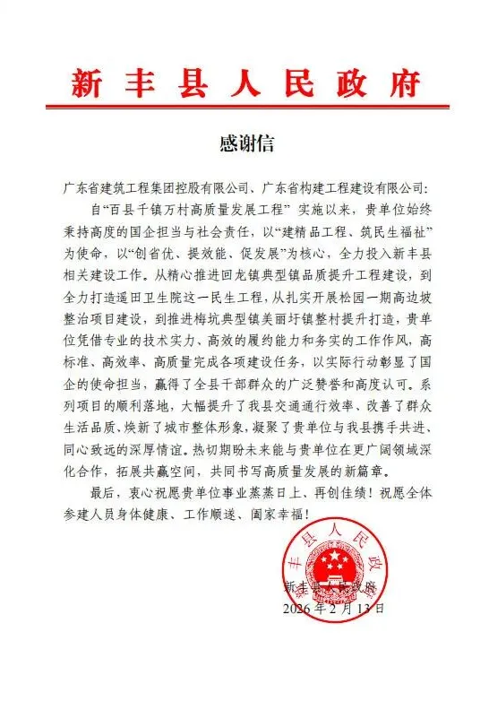 新丰县人民政府特向构建公司及上级主管单位建工控股发来感谢信,对公司在 “百千万工程” 中的突出贡献致以诚挚谢意。信中指出,构建公司秉持高度的国企担当与社会责任,以 “建精品工程、筑民生福祉” 为使命,高效推进回龙镇典型镇品质提升、遥田卫生院建设、松园一期高边坡整治、梅坑典型镇美丽圩镇整村提升等多个重点项目。公司凭借专业的技术实力、高效的履约能力和务实的工作作风,高标准、高效率、高质量完成各项建设任务,大幅提升了新丰县交通通行效率、改善了群众生活品质、焕新了城市整体形象,以实际行动彰显国企使命担当,赢得全县干部群众的广泛赞誉和高度认可。新丰县人民政府更热切期盼未来能与公司在更广阔领域深化合作,携手书写高质量发展新篇章。