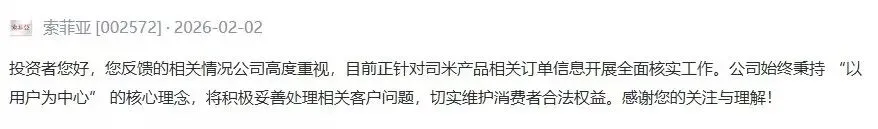 截至发稿,索菲亚仅在其投资者互动平台表示“正开展全面核实工作”。