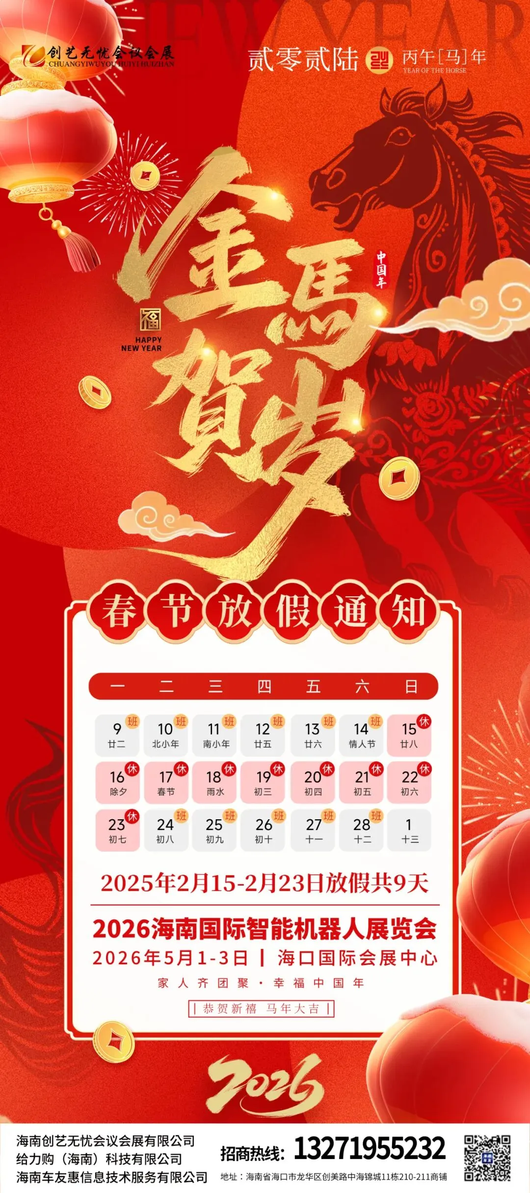 根据国家法定节假日安排,结合公司实际情况,公司本部2026年春节放假时间为2月15日(农历腊月二十八、周日)至23日(农历正月初七、周一)放假调休,共9天。2月24日(农历正月初八、周二)恢复正常上班。二、安全提示