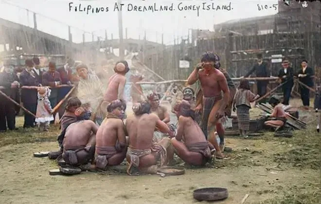 图中这一圈人叫菲律宾土著展演队,身上裹着草编和布条,胳膊腿儿上挂着串珠和贝壳,皮肤被阳光一烤泛着铜红色,男人多半赤着上身,头发抹得油亮,坐在地上围着一口黑锅吃东西,锅沿上还蹭着白乎乎的汤渍,旁边散着几块扁圆的石板当垫子,地面是又硬又尖的枯草,踝骨贴在上面看着都硌得慌。