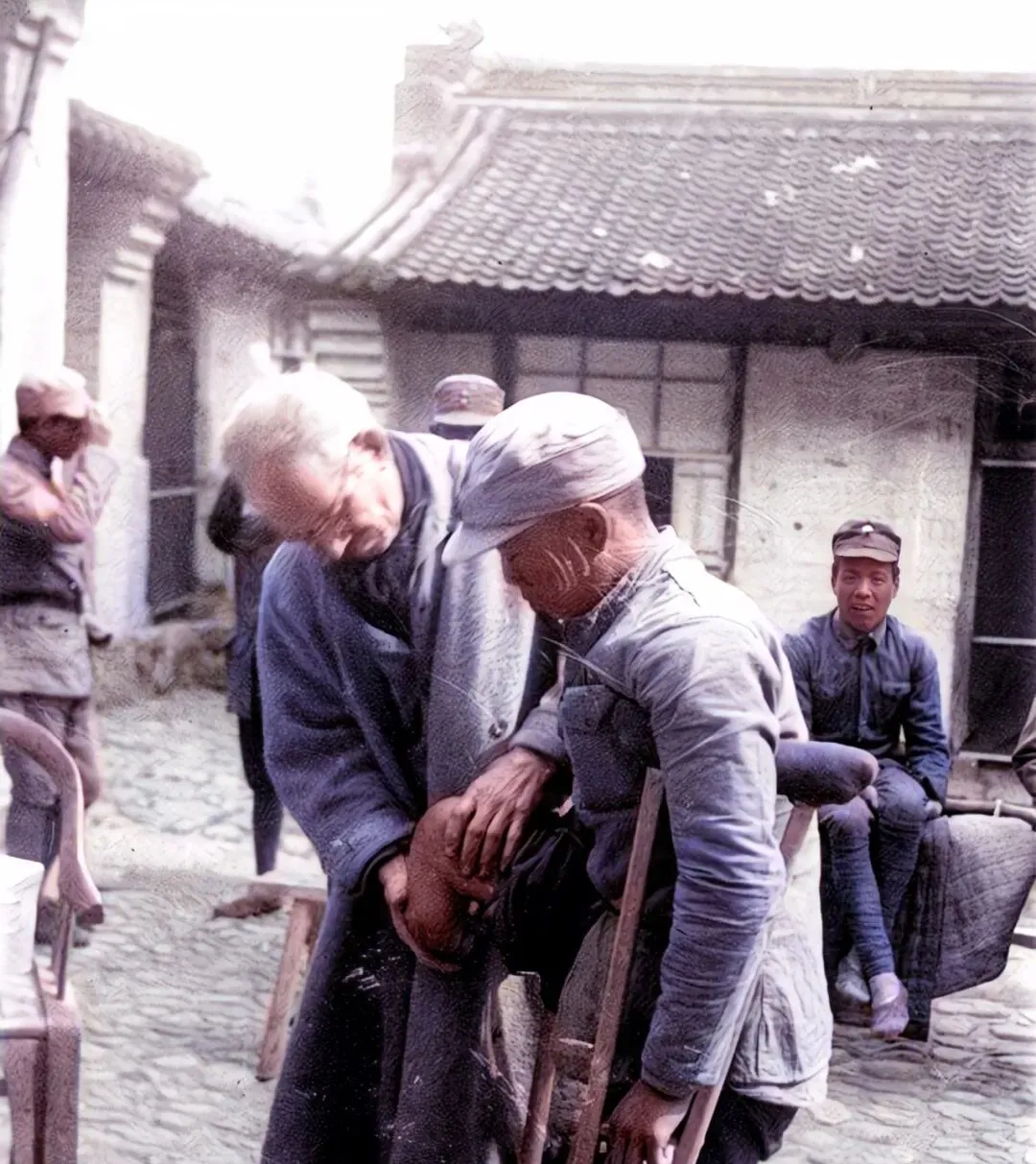 屋里屋外有人在看,远处的兵坐在门槛边上,笑得含蓄,像是在给兄弟壮胆,院心的青石板被岁月踩得滑,角落里一把小木椅被人匆忙地挪开,留下一道细细的拖痕,风从巷口吹进来,卷起些草灰,落在白求恩的发梢上,亮闪闪的,像一层霜。
