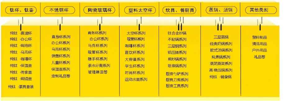 塑料制品、清洁用品、厨房用品、不锈钢厨具、刀剪、竹木制品、玻璃、陶瓷、杯壶、茶具、一次性用品、浴室用品、手套、置物收纳、小家具、家居用品、宠物用品、打火机、小百货、打火机、指甲剪、钥匙扣、小五金、饰品、太阳眼镜、电子钟表、字牌、扑克、文体用品、粘鼠板、多元百货、电子钟表。