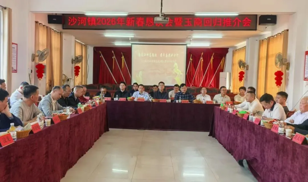 2月14日下午,沙河镇2026年新春恳谈会暨玉商回归推介会召开。沙河镇领导班子成员、各村(社区)支书、有关单位负责人,企业家、经济能人等各界代表参加会议。沙河镇人大主席罗旭顺主持会议。