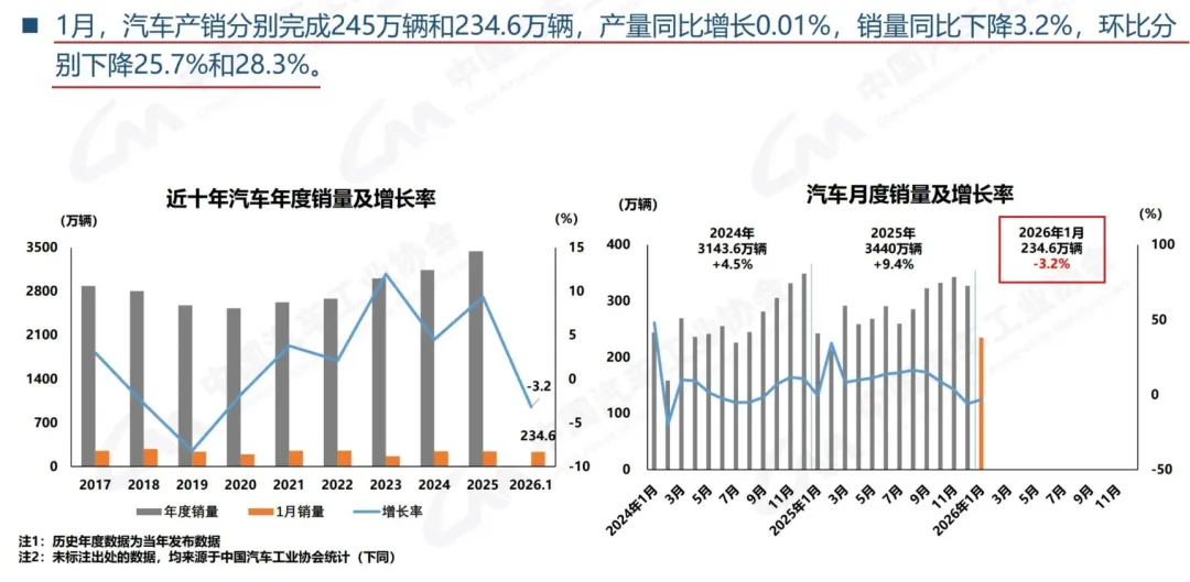 1月,汽车产销分别完成245万辆和234.6万辆,产量同比增长0.01%、销量同比下降3.2%;而环比分别下降25.7%和28.3%;