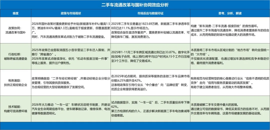 比如解决二手车跨省通行的隐形限制,实现真正的全国通办,对于合规经营的二手车经销企业的税收优惠,这将直接引导二手车收购价格的回升。旧车因流通顺畅多卖一点,国家补贴一点,金融支持再优惠一点,这些对于消费的刺激效应将是有效且指数级的。