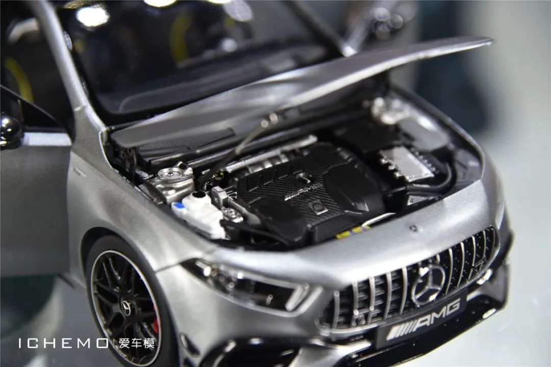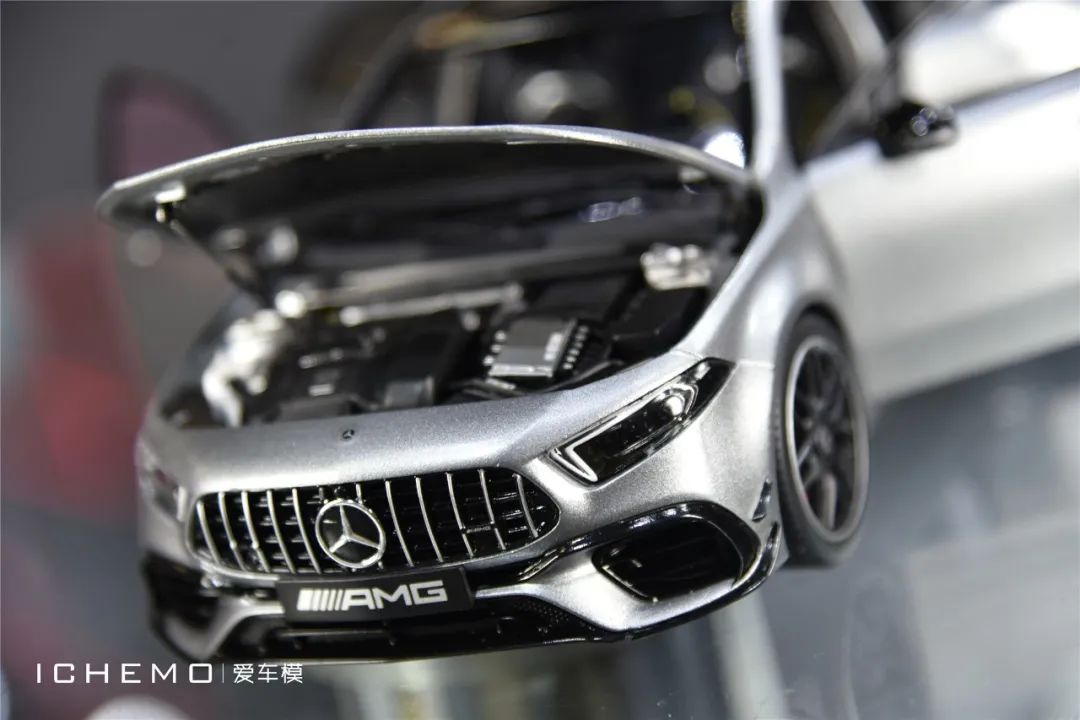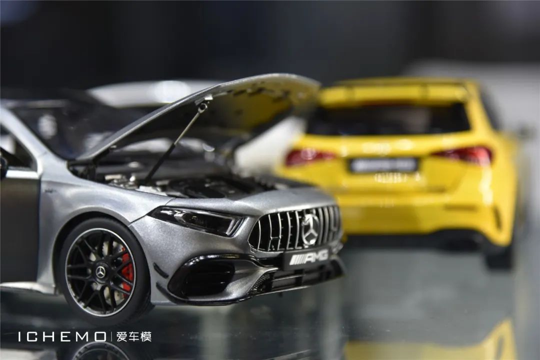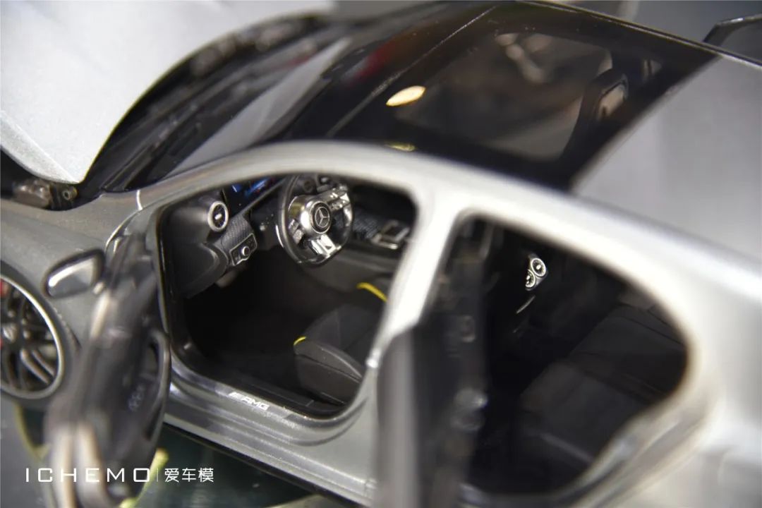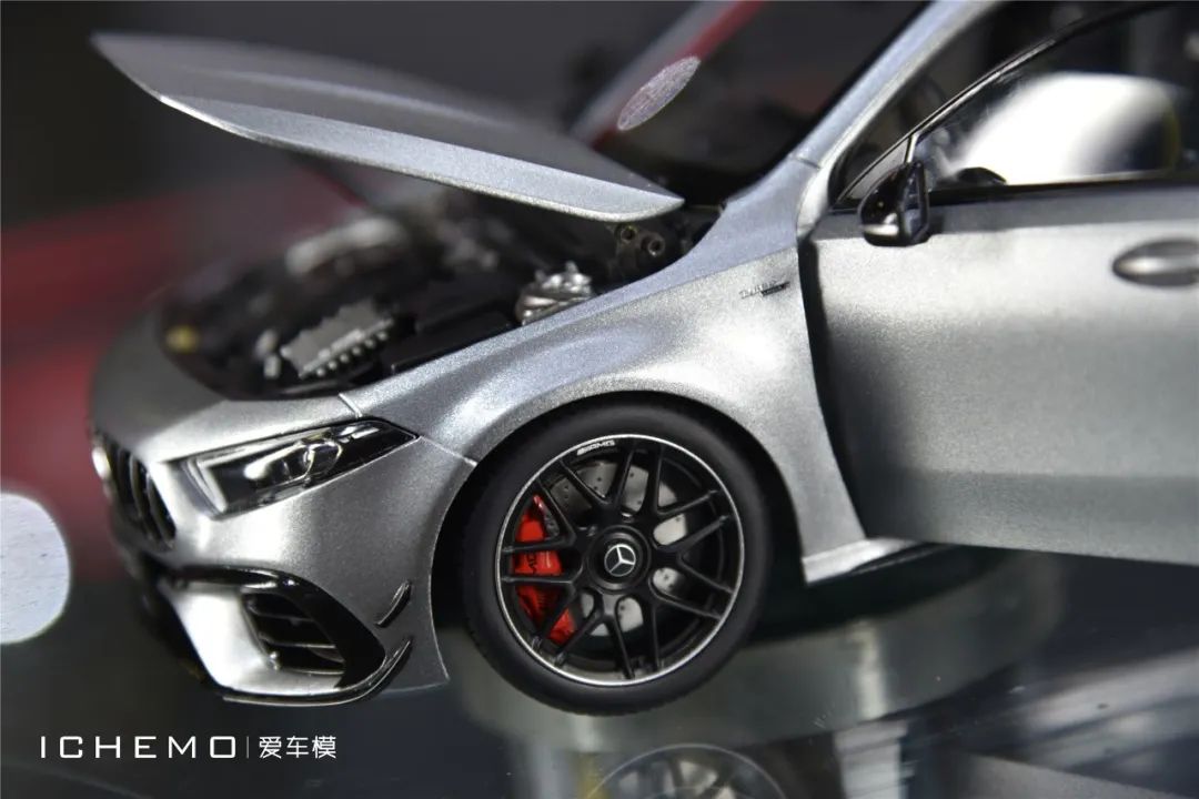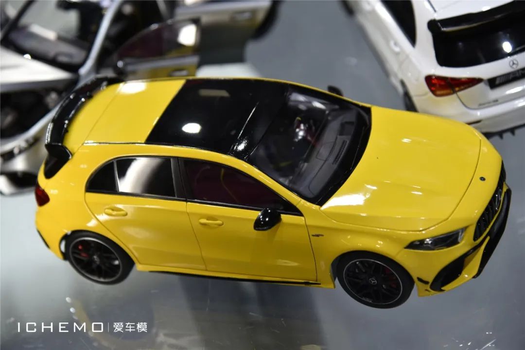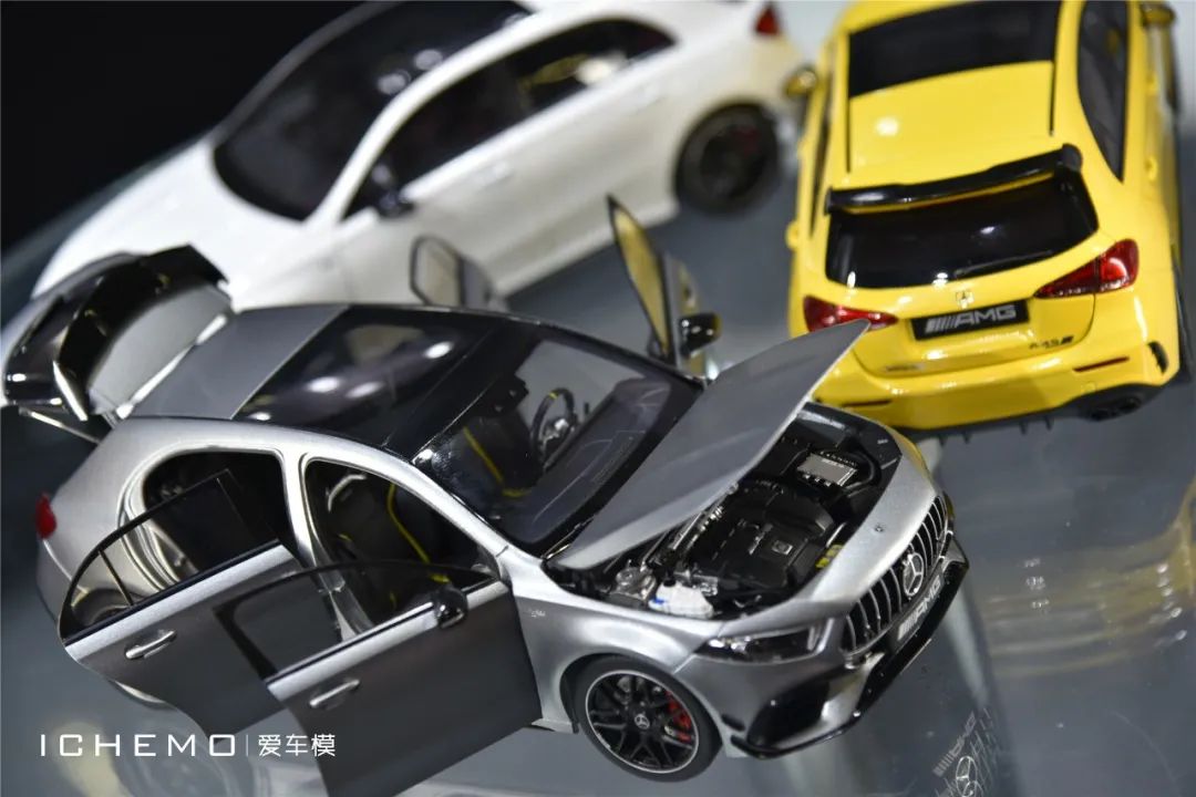 模型为 1:18 合金全开工艺设定:四门/两盖件可开,方向盘件随前轮转向;模型车身配色方面将参考 Mercedes-AMG A 45 S 4MATIC+ Aerodynamic Package 实车方案,目前 NZG 展示了(消光灰、黄、白、黑)四款颜色。值得一提的是,爱车模 ICHEMO 会在未来联名 NZG 推出定制配色和涂装款式!