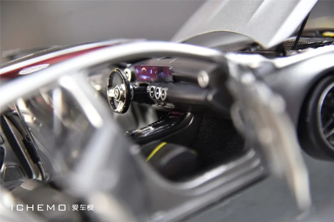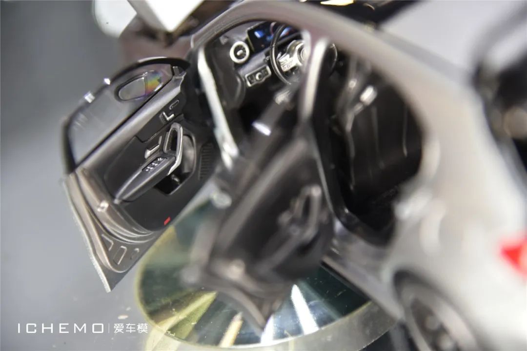 座椅式样、镂空配置参考实车还原,可见 AMG 移印标识 - 迎宾踏板、门板内衬版警示灯等细小配置亦为移印工艺刻画。