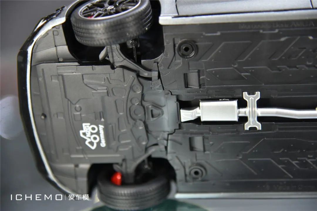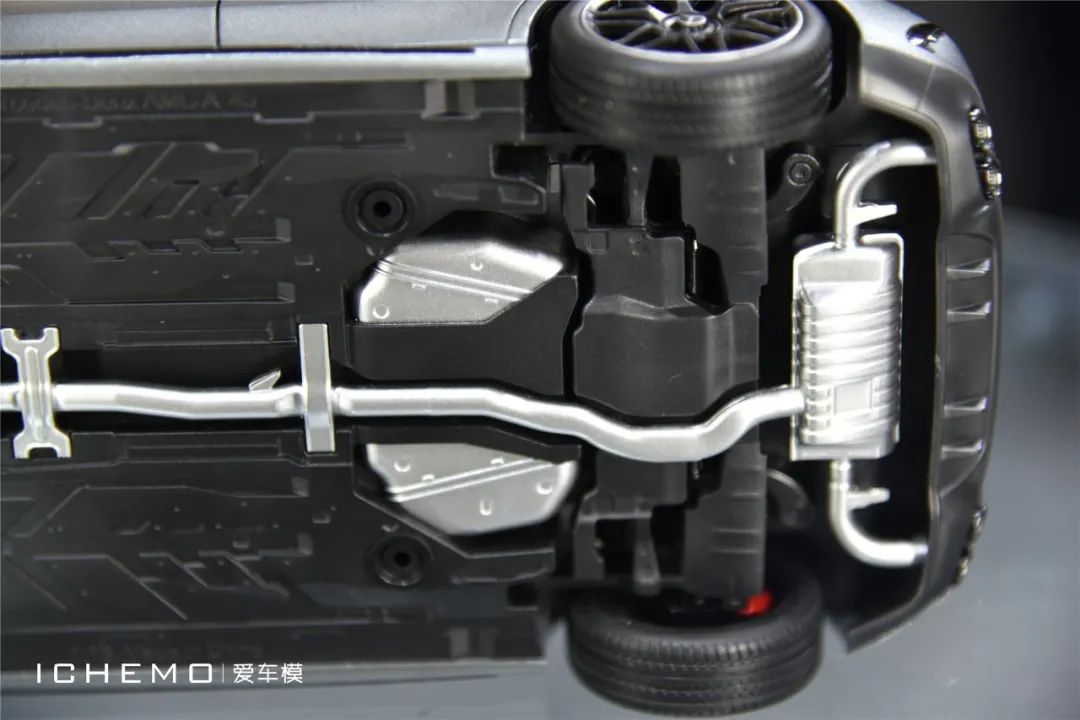模型底盘大底为塑料材质,设有四个螺丝孔位,另可见排气系统分件、油箱分色等细节刻画 - 由于车尾细节还需要修改,目前的底盘状态仅供参考。