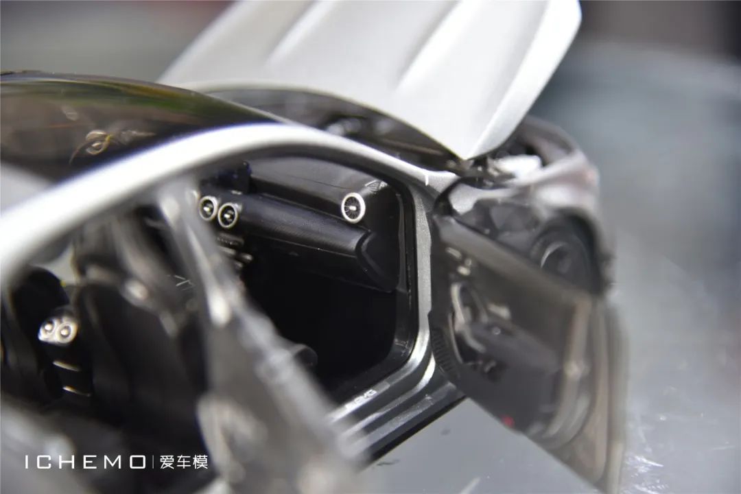 模型后备箱盖件处车标为蚀刻片件,其盖件与车体有 “液压杆” 支撑保持姿态;尾翼(和车头风刀等)空气动力学组件参考实车配置还原。