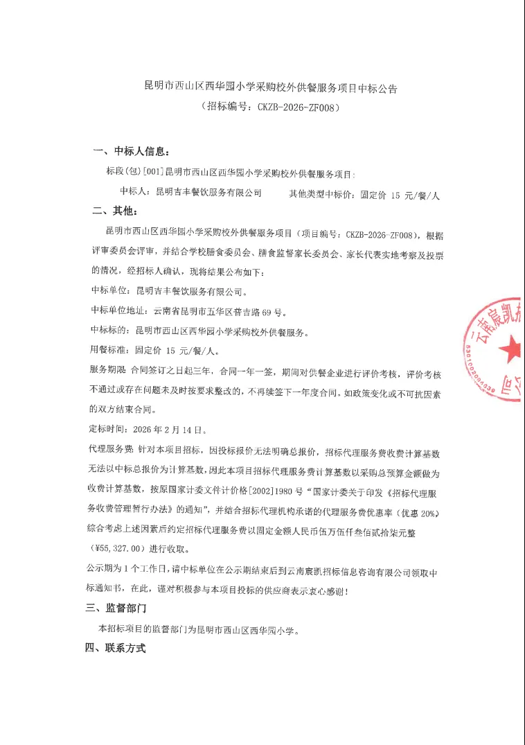 转自中国招标投标公共服务平台:昆明市西山区西华园小学采购校外供餐服务项目中标公告