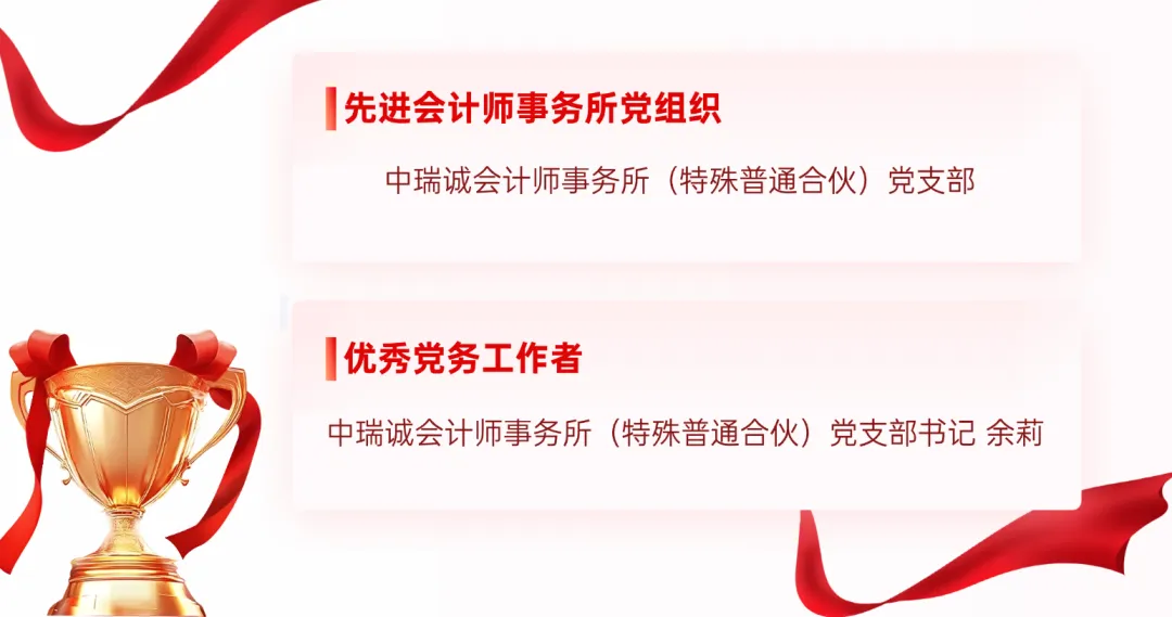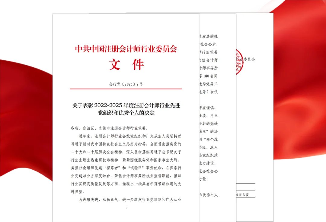 值此2026年新春佳节即将到来之际,中国注册会计师行业党委印发《关于表彰2022-2025年度注册会计师行业先进党组织和优秀个人的决定》(会行党〔2026〕2号),对2022-2025年度行业中表现突出、具有示范带动作用的先进典型予以表彰。经省级推荐、多轮评审与社会公示,全国共评选出10个先进行业党组织、130个先进会计师事务所党组织,并对一批优秀个人进行表彰。中瑞诚会计师事务所(特殊普通合伙)党支部凭借扎实的党建工作与显著的业务融合成效,荣获“先进会计师事务所党组织”称号;党支部书记余莉获评“优秀党务工作者”。
