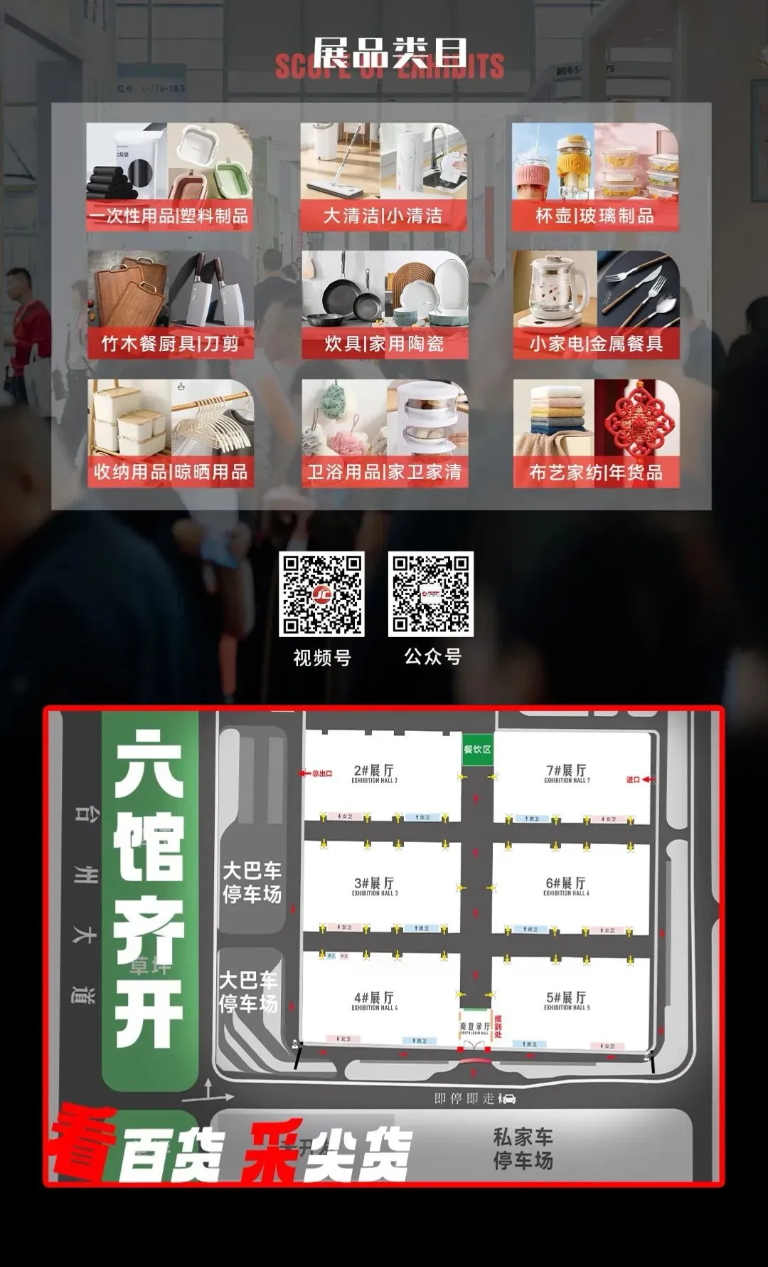 本届展会展览面积达60000平方米。展览品类:一次性用品、塑料制品、清洁用品、杯壶、玻璃制品、竹木、餐厨具、刀剪、陶瓷、炊具、小家电、晾晒用品、卫浴用品、布艺家纺、年货品等18大品类源头工厂参展。