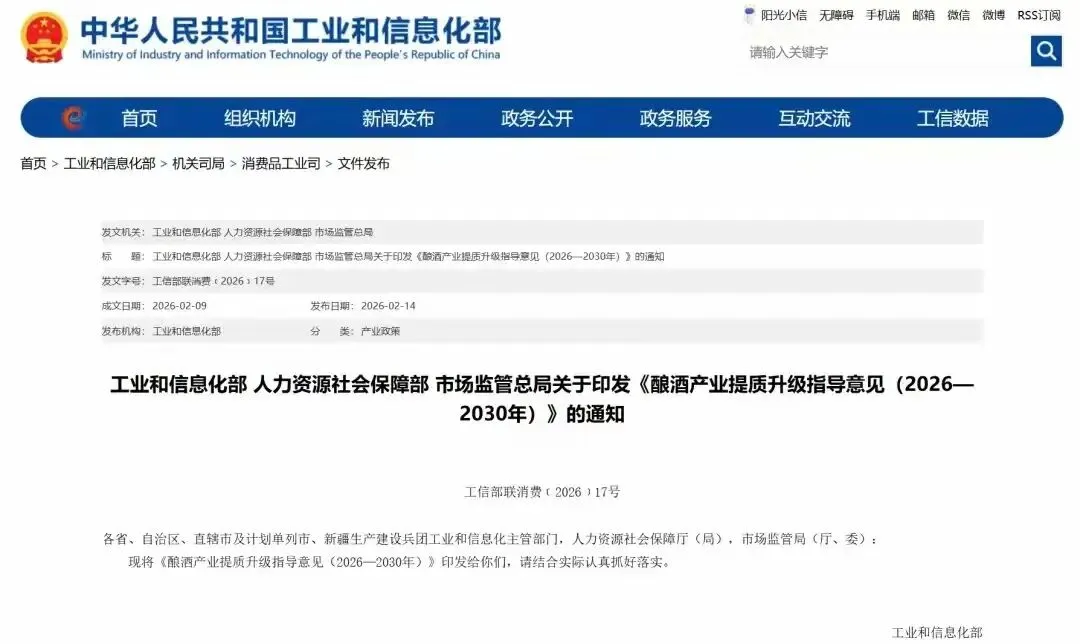 工信部等三部门印发《酿酒产业提质升级指导意见(2026—2030年)》。其中提出,到2028年,原料种植、生产酿造、流通消费融合发展水平持续优化,产品丰富度、品质认可度、品牌美誉度明显增强,企业生产方式、经营模式加快转型升级,消费场景和消费模式持续丰富拓展。产业布局进一步优化,产区引领、园区驱动作用进一步增强,培育3个以上千亿级传统优势酒产区,10个以上百亿级特色酿酒产业园区,形成“百亿园区、千亿集群、万亿产业”发展格局,标准供给、质量安全、人才培养等配套能力建设取得积极进展。到2030年,数智化、绿色化、国际化发展水平持续提升,发展质量效益大幅提高,产业规模稳中有进,产能布局、产品结构持续优化,形成产品种类丰富、生产流通有序、区域布局合理、产业生态健康的产业体系。