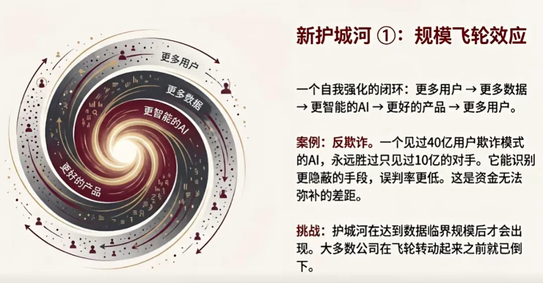 先看第一个真正的护城河——规模飞轮效应。为什么在AI行业,规模飞轮效应一旦形成,就会成为难以逾越的壁垒?举个反欺诈领域的例子,可能有很多公司都在做这个业务,但如果你见过40亿用户的欺诈模式,而竞争对手只见过10亿用户的欺诈模式,你的AI就能识别出更隐蔽的欺诈手段,误判率也会比对手低很多。这就是数据飞轮的力量。
