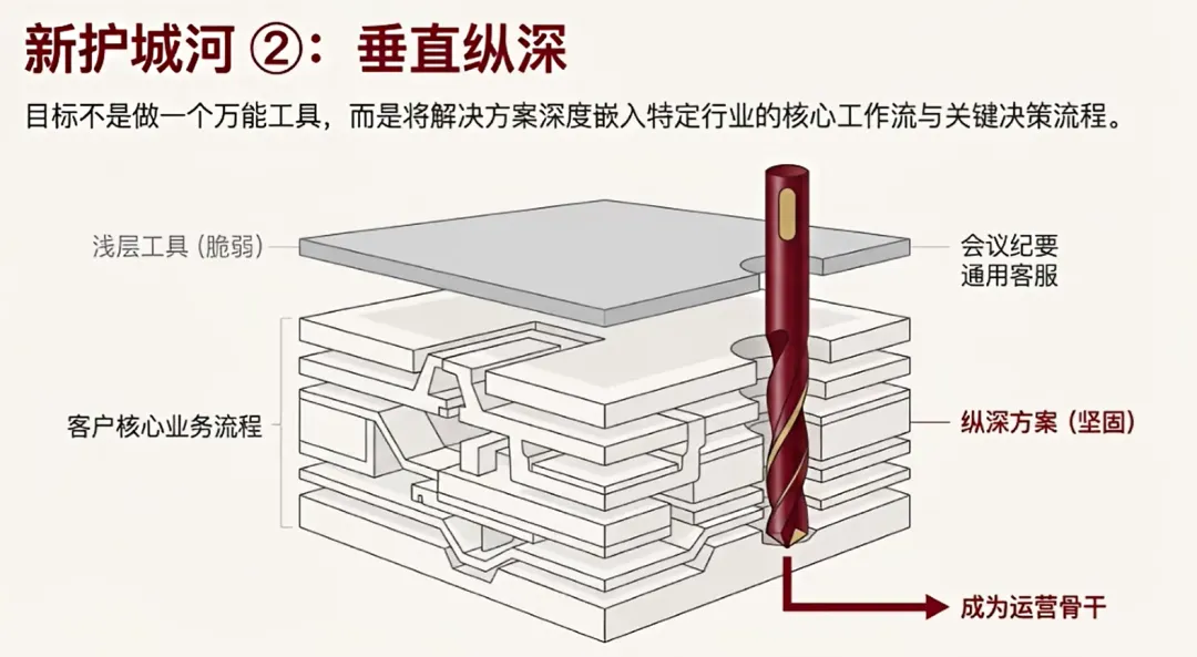 第二个真正的护城河——垂直纵深。这和我们刚才说的通用型AI产品有什么区别?那些能存活下来的AI公司,有个共同特点:它们从不会尝试做一个“什么都能做”的工具,而是会专注在一个非常细分的垂直场景里,把产品做深做透。