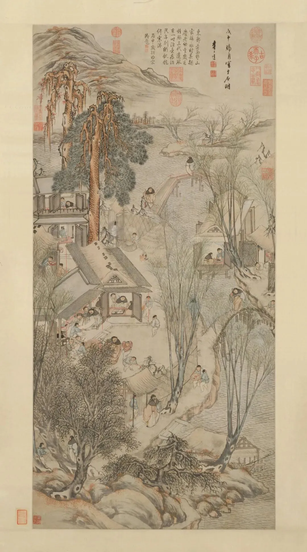 明代画家李士达的《岁朝村庆图》,生动描绘了山村岁朝时节的欢庆场景。