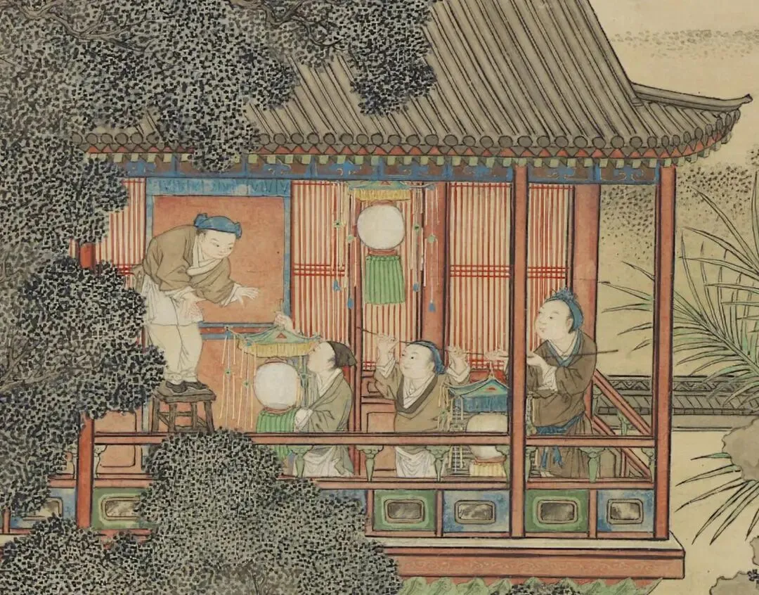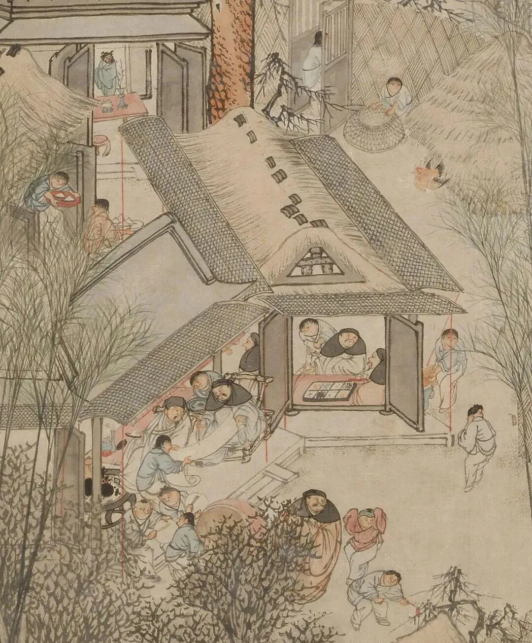 画中屋舍齐整,庭院洁净,人物或赏画,或携童子,环境井然有序,透露出年节前洒扫庭除后的清新愉悦,正是“扫尘”习俗的最佳视觉注解。