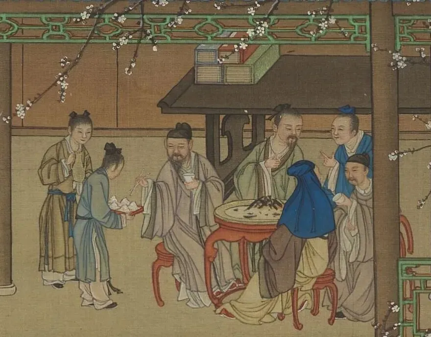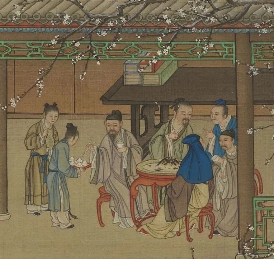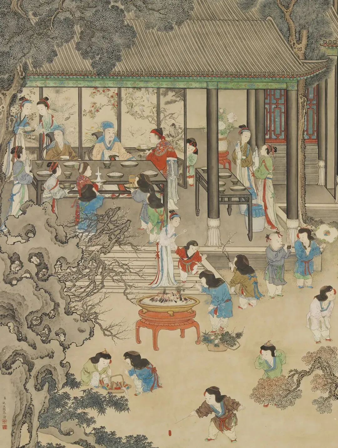 此画描绘了过年阖家欢庆团圆的场面,画中屋内陈设精致,桌椅摆放规整,各种古玩器物错落有致,尽显古朴典雅之美,从侧面反映出扫尘之后室内整洁有序的状态,体现出当时人们对生活环境美学的追求。