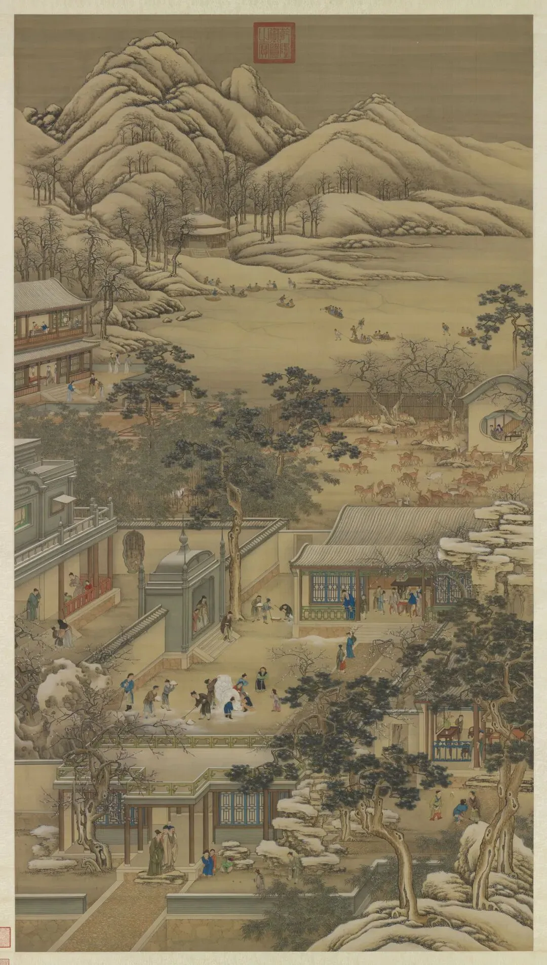 这套组画描绘了雍正皇帝四季十二个月的生活。在“腊月赏雪”图中,除了赏雪活动,画面中的宫殿台榭、庭院台阶均显得格外洁净,体现了皇家苑囿在重要节前必有的严谨洒扫制度。画中的建筑与环境,处于一种被精心维护的、庆典前的完美状态,是扫尘习俗在宫廷礼仪层面的高级体现。