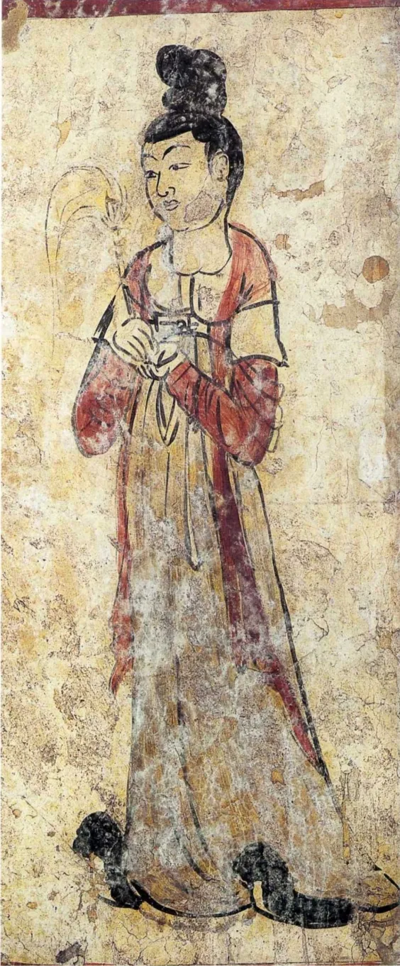 这幅壁画为墓室东壁南起第三幅,侍女头梳高高的螺髻,身着窄袖长裙,外套半臂,足穿翘头的云头履,双手上下相扣地执一把拂尘,作静静站立状。侍女手持的拂尘与今日鸡毛掸子异曲同工,都是古人“无死角”清洁的工具。