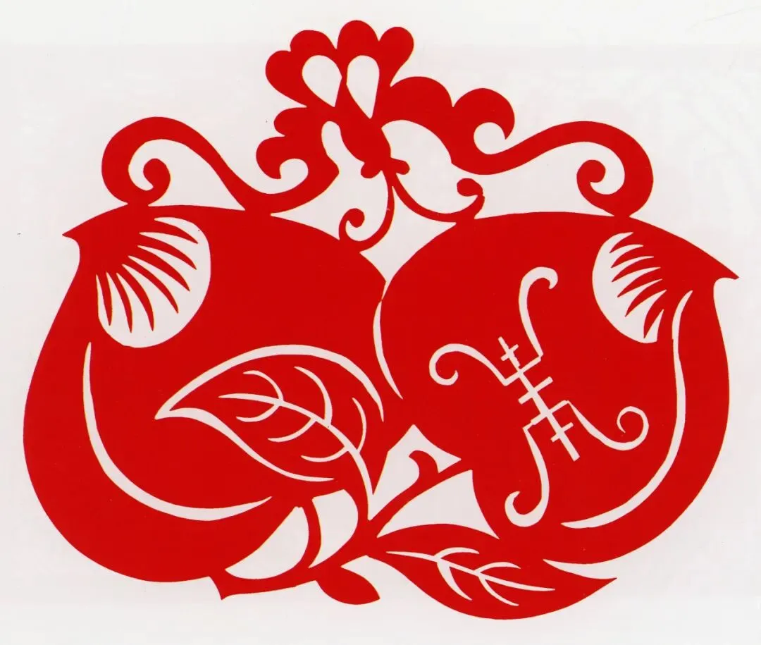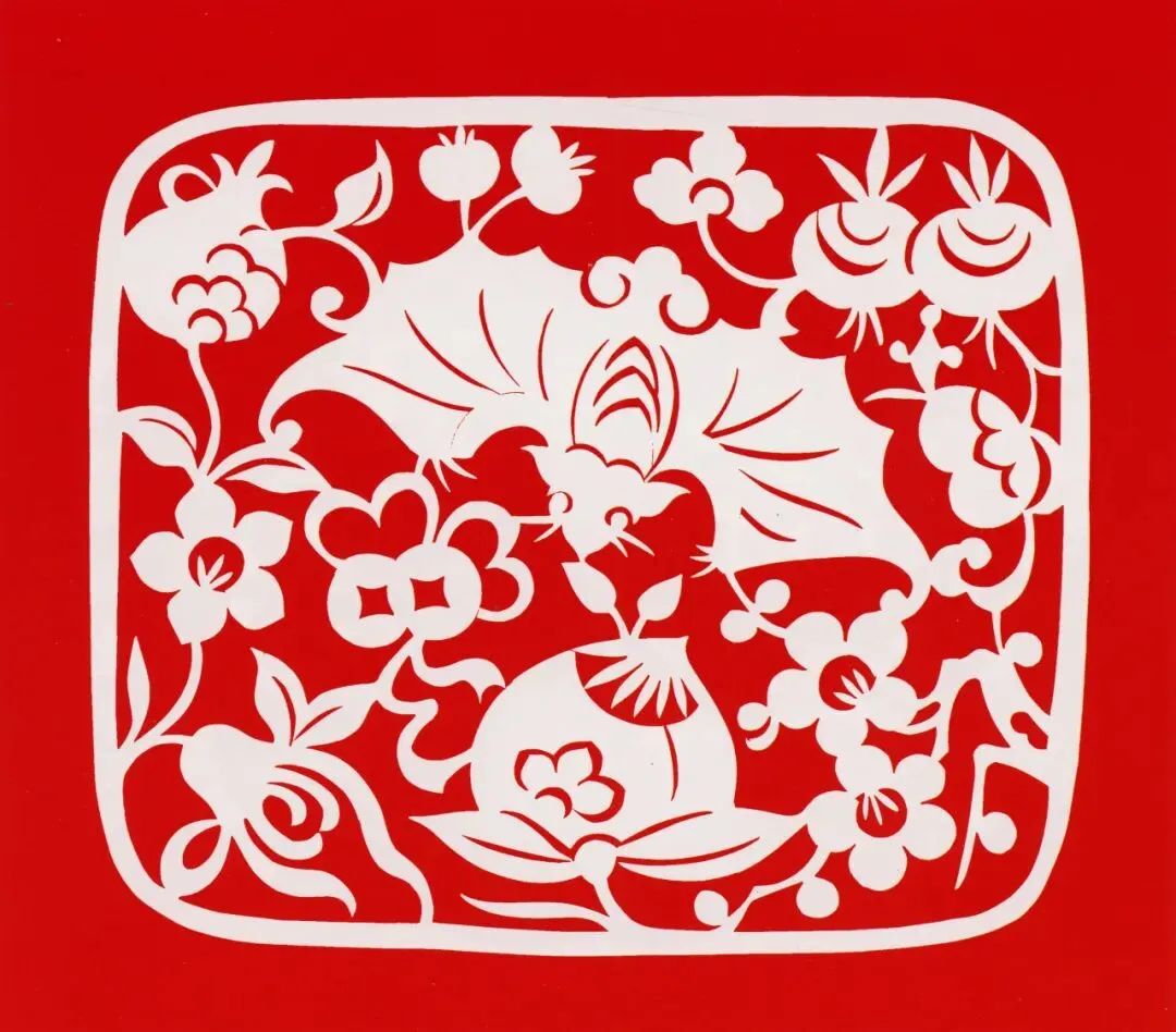 这是一幅将人们许多美好的心愿组合在一起的剪纸作品。蝙蝠、寿桃、佛手、双钱、荸荠、石榴、柿等物品,在同一幅图里出现,表达了人们对美好生活的多方面追求。利用谐音、寓意等传统比喻手法,表达了作者的多种祝愿。蝙蝠和寿桃组合在一起,寓意为“福寿双全”,佛手和双钱也组合为“福寿双全”,蝙蝠、荸荠组合成“洪福齐天”,柿子与如意纹组合在一起寓意为“事事如意”。石榴寓多子,双钱寓财富,表现出老百姓对美好生活的向往。