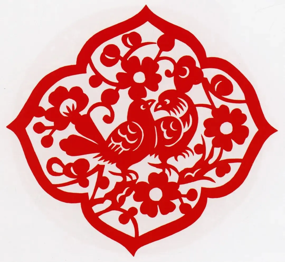 这是一幅蔚县剪纸作品。两只喜鹊象征喜上加喜,双喜临门,梅花喻眉梢。