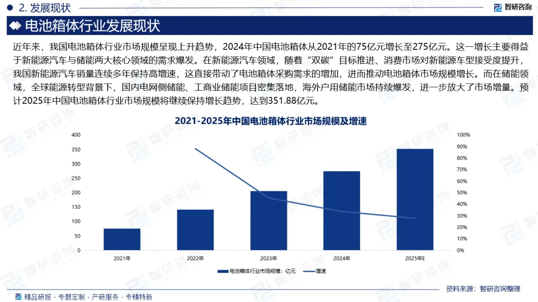 发展现状:近年来,我国电池箱体行业市场规模呈现上升趋势,2024年中国电池箱体从2021年的75亿元增长至275亿元。这一增长主要得益于新能源汽车与储能两大核心领域的需求爆发。预计2025年中国电池箱体行业市场规模将继续保持增长趋势,达到351.88亿元。