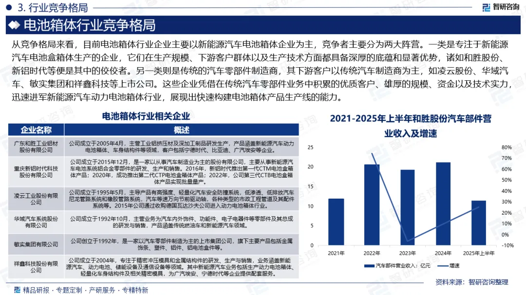 企业格局:从竞争格局来看,目前电池箱体行业企业主要以新能源汽车电池箱体企业为主,竞争者主要分为两大阵营。一类是专注于新能源汽车电池盒箱体生产的企业,它们在生产规模、下游客户群体以及生产技术方面都具备深厚的底蕴和显著优势,诸如和胜股份、新铝时代等便是其中的佼佼者。另一类则是传统的汽车零部件制造商,其下游客户以传统汽车制造商为主,如凌云股份、华域汽车、敏实集团和祥鑫科技等上市公司。这些企业凭借在传统汽车零部件业务中积累的优质客户、雄厚的规模、资金以及技术实力,迅速进军新能源汽车动力电池箱体行业,展现出快速构建电池箱体产品生产线的能力。