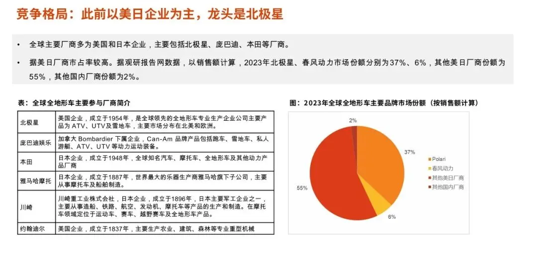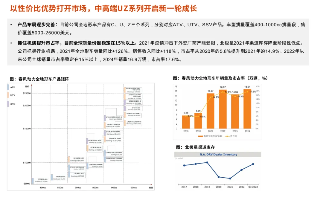 在美日企业主导的全球格局中,中国企业长期处于产业链中下游,以代工、低价竞争为主要发展模式。而春风动力的出现,打破了这一格局 ——2023 年,其以 6% 的销售额市占率跻身全球全地形车市场前列,成为唯一进入全球第一梯队的中国品牌;2024 年,其全地形车全球销量市占率达 17.6%,销量突破 16.9 万辆,实现了从 “跟跑” 到 “并跑” 的跨越。