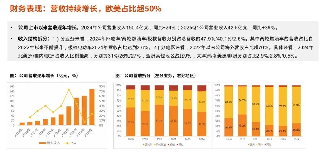 自上市以来,春风动力的营收始终保持持续增长的态势,2024 年公司营业收入达 150.4 亿元,同比增长 24%;2025 年第一季度,营业收入达 42.5 亿元,同比增长 39%,实现开门红。营收的高速增长,核心驱动力来自海外市场的拓展。