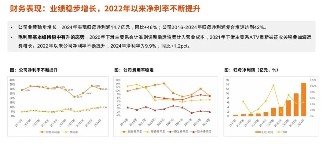 在营收持续增长的同时,春风动力的盈利水平也稳步提升,2024 年实现归母净利润 14.7 亿元,同比增长 46%;2016-2024 年,归母净利润复合增速达 42%,展现出强劲的盈利能力。净利率方面,2022 年以来公司净利率持续提升,2024 年净利率达 9.9%,同比提升 1.2 个百分点,盈利水平创历史新高。
