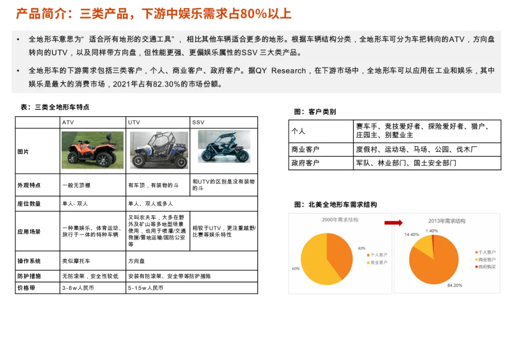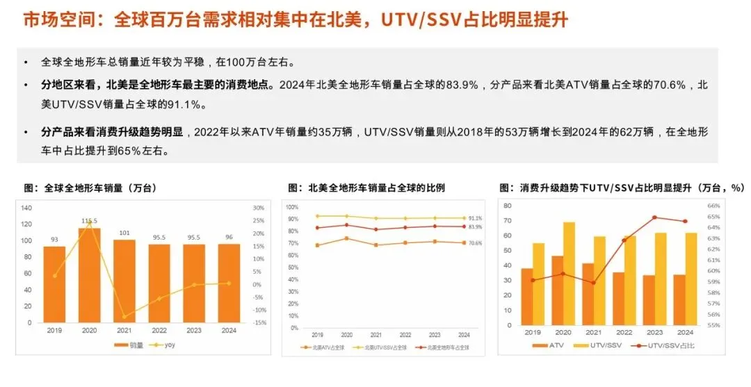 趋势一:消费升级催生高端化需求,UTV/SSV 成增长核心全球动力运动市场的消费升级趋势显著,以全地形车为例,全球总销量稳定在 100 万台左右,而价格更高、性能更强的 UTV/SSV 销量占比从 2018 年的 56% 提升至 2024 年的 65%,成为行业增长的核心动力。在北美市场,UTV/SSV 的销量占比更是高达 91.1%,消费者对产品的性能、舒适性、智能化要求不断提升,高端化产品的市场空间持续扩大。