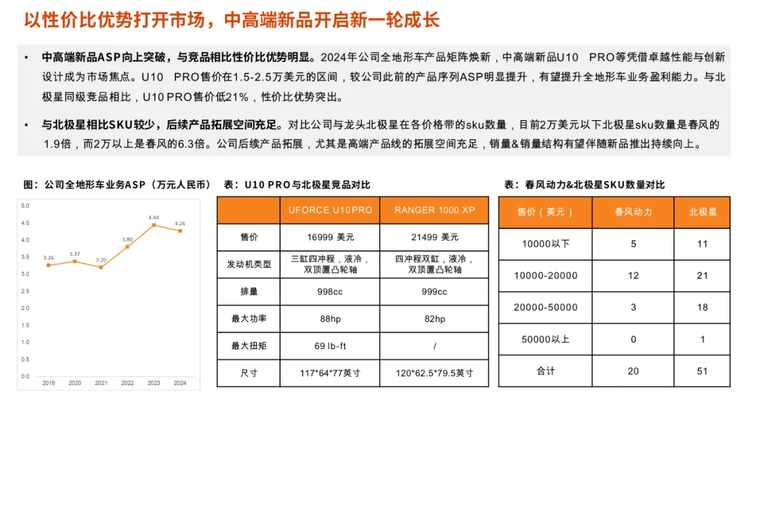 从 “贴牌出口” 到 “自主品牌出海”,从 “价格竞争” 到 “价值竞争”,春风动力的品牌形象不断升级。2024 年,其全地形车中高端新品 U10 PRO 上市,售价达 1.5-2.5 万美元,与北极星同级竞品 RANGER 1000 XP 相比,售价低 21%,而最大功率达 88hp,高于北极星的 82hp,性价比优势突出。U10 PRO 的上市,标志着春风动力成功切入全球高端全地形车市场,实现了从 “高性价比” 到 “高性能高端化” 的转型。