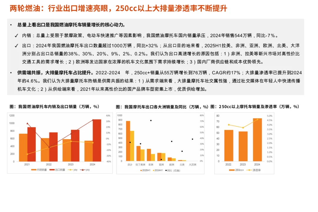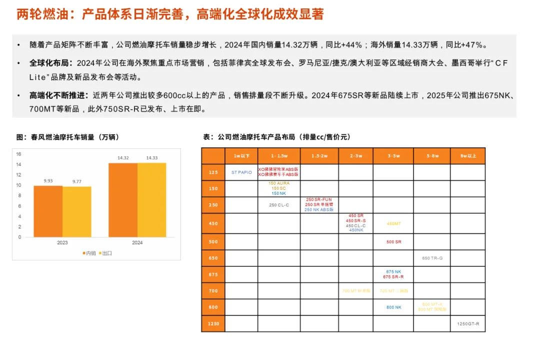 在全品类布局上,春风动力构建起 “全地形车 + 燃油摩托车 + 电动两轮车 + 公务车及配件” 四大产品体系,覆盖动力运动行业的核心领域。全地形车作为核心出海产品,全球市占率稳定在 15% 以上;燃油摩托车从 125cc 到 1250cc 全排量覆盖,>200CC 跨骑摩托车销量登顶行业第一;电动两轮车通过极核品牌实现差异化竞争,成为行业智能化标杆;公务车及配件则覆盖国宾、警用等特殊领域,提升了品牌的高端形象与市场覆盖面。全品类布局让春风动力能够满足不同市场、不同消费群体的需求,提升了企业的抗风险能力与市场竞争力。