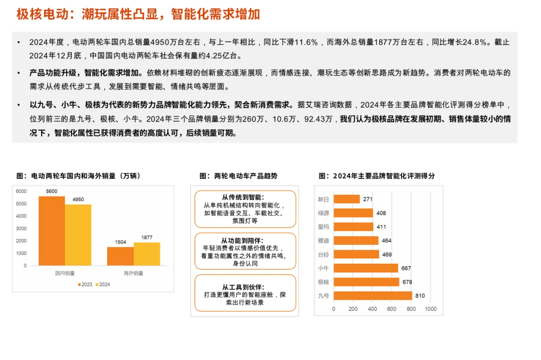 极核的电动化布局,并非简单的 “燃油车改电动车”,而是基于电动化平台的全新研发。其产品具备鲜明的智能化特征,搭载智能交互屏、智能语音交互、车载社交等功能,契合年轻消费者对智能出行的需求。2024 年,在艾瑞咨询发布的中国两轮电动车品牌智能化评测得分榜单中,极核以 678 分位列第二,仅次于九号,高于小牛、雅迪等品牌,智能化能力得到行业与消费者的高度认可。