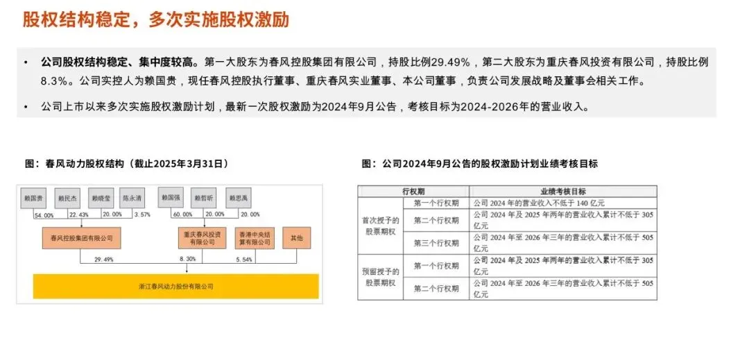 2024 年,春风动力营业收入达 150.4 亿元,超额完成股权激励第一个行权期的考核目标,为股权激励的行权奠定了基础。股权激励计划的实施,将公司核心团队的利益与公司的长期发展绑定,充分调动了核心团队的积极性与创造性,为公司海外市场的持续拓展与业绩的长期增长提供了重要保障。