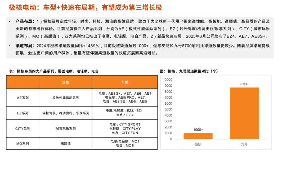 2024 年,极核电动销量突破 10 万辆,同比实现高速增长,成为春风动力的第三增长极。在产品布局上,极核构建起 AE(极致性能运动系列)、EZ(轻松驾驭 / 格调出行系列)、CITY(城市玩乐系列)、MO(高颜值系列)四大产品系列,覆盖电摩、电轻摩、新国标电动自行车全品类,满足不同市场的需求;在渠道布局上,2024 年极核渠道数量同比增长 1489%,突破 1000 家,虽然与九号 8700 家渠道相比仍有差距,但增长速度迅猛,未来市场空间巨大。