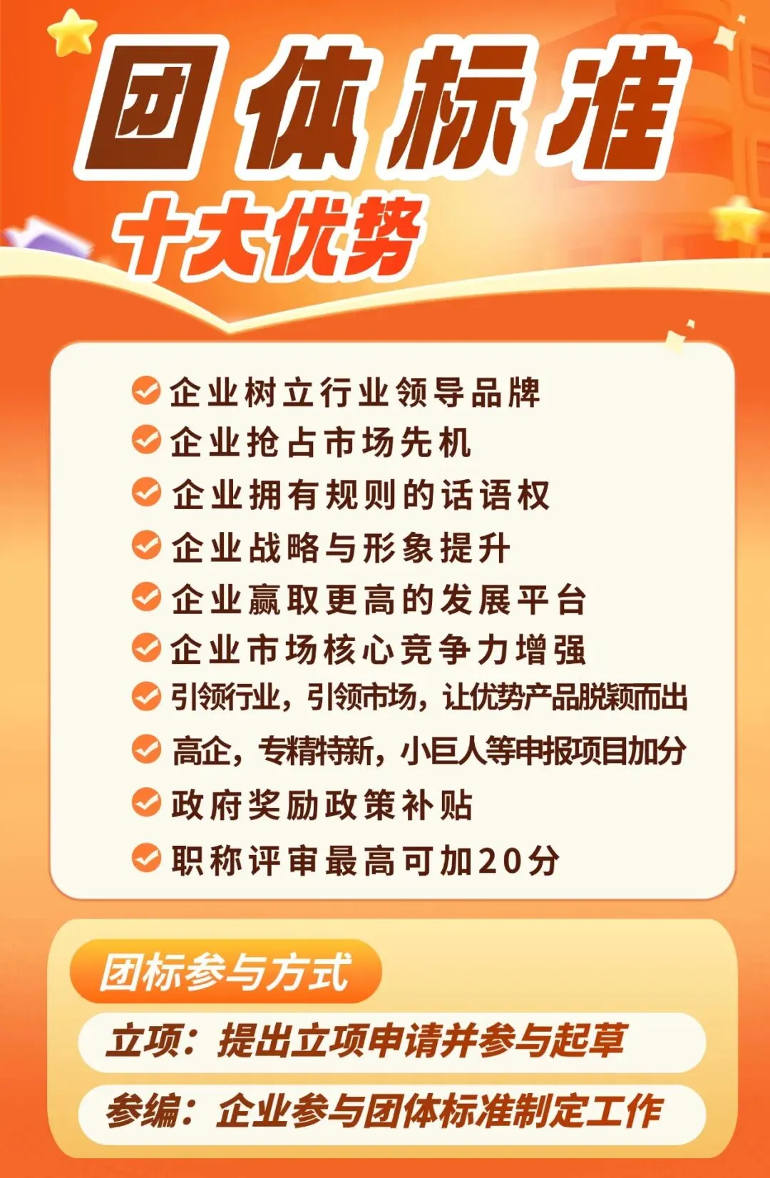 ❓ 我的企业(中小企业/龙头企业),到底适合参编还是主导起草?❓ 评职称(中级/副高/正高),参与1项参编够不够?起草和参编到底能加多少分?❓ 如何避开“水团标”,找到高质量、能落地、能加分的团体标准资源?❓ 企业做完标准后,怎么快速对接政府补贴、应用到招投标中?★