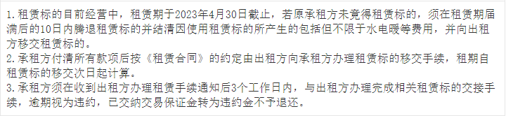 1、租赁标的成交后,承租方须一次性支付首年全部租金,第二年起每年租金随当地市场价格变动而浮动,调整的租金参照同区域、同地段市场租金价格并经出租方内部决策研究通过后,重新拟定租金事宜的补充协议。