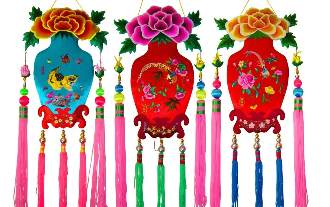 牡丹为我国著名花卉,花朵硕大,雍容华贵,被称为“万花一品”。花瓶在庆阳民俗艺术中是经常表现的题材,取象于瓶子的造型,鼓腹象征为母体,意在子孙繁衍。庆阳的刺绣艺人常以牡丹与花瓶为组合,寓意“富贵平安”与“子孙昌盛”。国家级传承人贺梅英的这组牡丹花瓶,在花瓶的腹部还绣有“猫扑蝶”“喜鹊弄梅”“凤凰戏牡丹”的图案,更加凸显生命繁衍兴盛,生活幸福美满的美好祈愿。