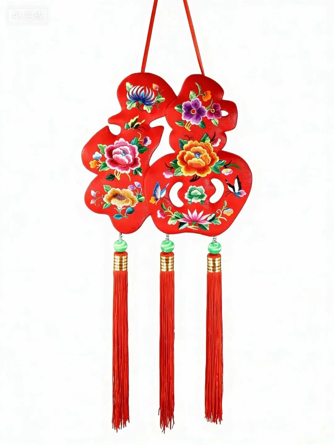民间艺术中花卉一直是亘古不变的主题,这幅作品的巧妙之处在主题福字上绣有四时花卉,梅花映春、牡丹喻夏、菊花表秋,梅花绘冬,通过四季更替的植物意象寄托对岁月平安顺遂、富贵安康的祈愿。
