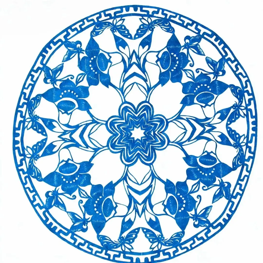 团花是庆阳剪纸中极具代表性的形式,用折叠的方法剪出对称且繁复的图案,寓意团圆美满、和谐圆满,经常用于春节与婚房装饰中。这幅作品以蓝色为基调,剪的并不是传统花卉纹样,而是将北方最常见的牵牛花作为创作主体,蝴蝶相随,清雅秀丽,具有田园意趣。