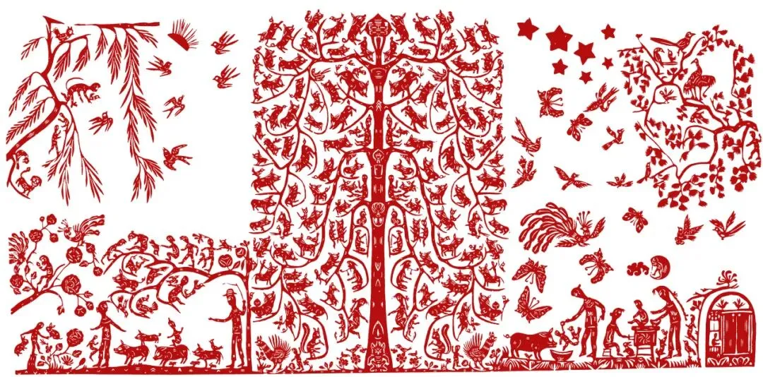 生命树是庆阳民俗剪纸中典型的传统纹样,是对树神的崇拜,是原始人类与树神交感巫术习俗的遗留——希望通过对树木的崇拜和模仿获得其旺盛的生命力。庆阳生命树剪纸造型或繁密茂盛或高清秀丽,但都生机盎然,神采奕奕,所传达的正是人类亘古不变的对生命的赞美、对生活的祝福。庆阳剪纸艺术大师彭粉女在晚年创作的生命树长卷中,白天与黑夜共存,天地人共存,空中飞鸟、蝴蝶、杨柳青松,生命树枝叶漫展,人们辛勤劳作耕耘,鸟语花香,孩童嬉戏,万物共生,呈现出一派和谐圆满的景象。