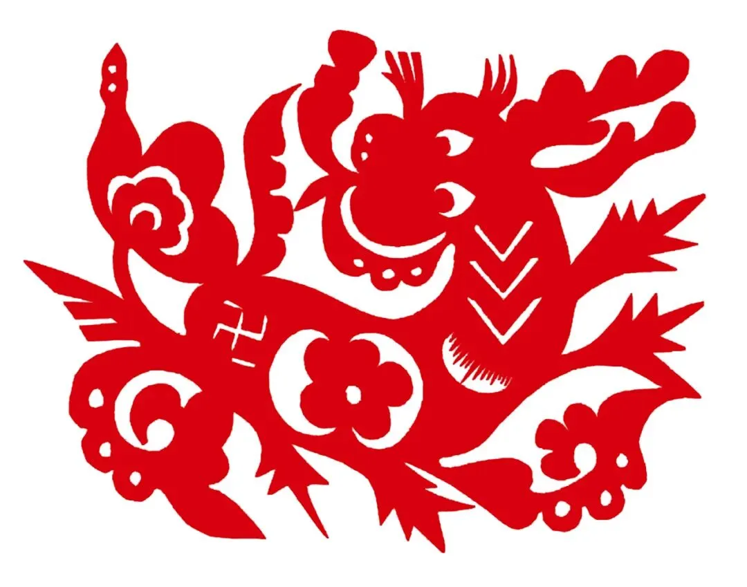 龙是中华民族的象征,也是吉祥喜庆的符号。在民间剪纸中龙纹样主要应用于节日庆典和婚俗喜花,有“龙凤呈祥”“二龙戏珠”等主题纹样。这幅作品中的小龙回头乖张的凝视,尾巴翘起,爪朝天,表现出龙的憨态可掬,调皮灵动,不同于大多数作品中表现龙的威严神秘,这幅剪纸作品也体现出庆阳民间剪纸艺术家独具风格的审美。