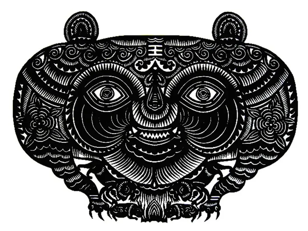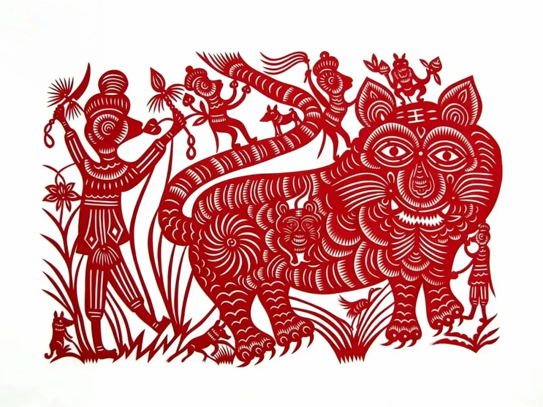 虎在民间被称为百兽之王,早在原始社会时期,人类就已经将虎视为守护神,风俗一直延续至今。虎在民俗文化中有辟邪、镇宅、护生、送子、增寿、驱疫、宜子孙升官等多种民俗功用。庆阳民俗文化中对虎的崇拜是极为广泛的,孩童穿戴虎头帽、虎头鞋,枕着虎头枕,肩上顶着虎香包,保护孩童平安健康。这幅剪纸是庆阳民间剪纸大师祁秀梅(女,庆阳镇原县人,1920-1991)代表作之一,老虎虽然侧着身子,但是头部却是正面重点刻画,肚子里还有一个虎宝宝,体现民间艺术家独特的视角。猴子与老虎居然嬉戏打闹,不觉得老虎害怕,有稚拙憨朴的童趣之美。