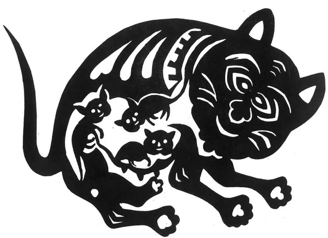 这是一只老猫,也是一只猫妈妈,肚子里面孕育着可爱的小猫。按照透视原理是看不见肚子里的猫宝宝,但是民间艺术家善于打破透视规律,大胆地打破常规遵循“内心的真实”。