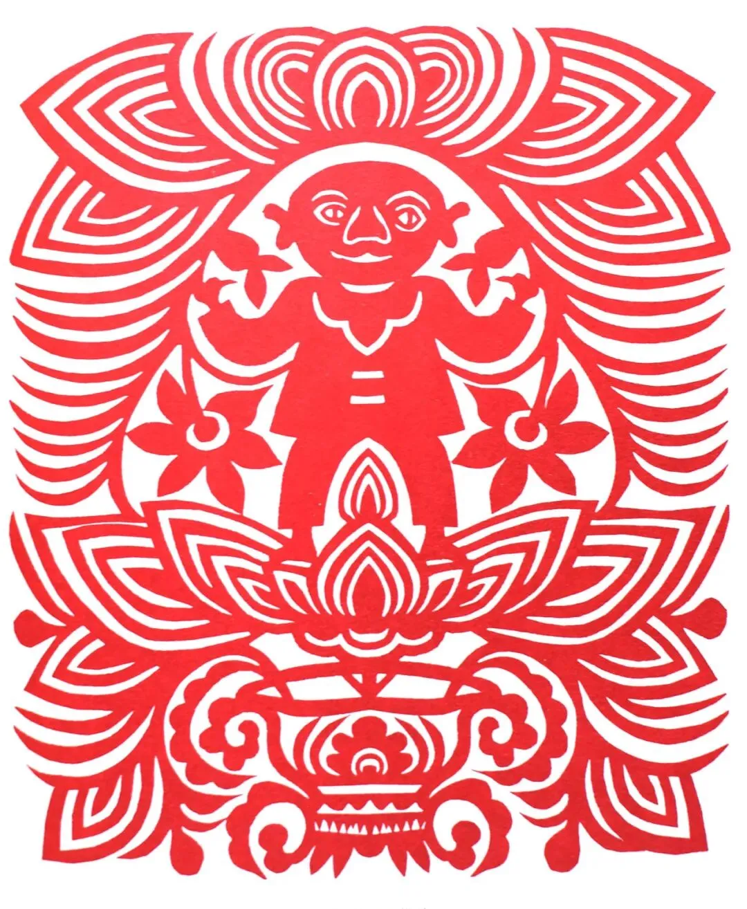 代表生殖繁衍之神的抓髻娃娃,一般贴在结婚时的洞房里,称“喜花”,“喜娃娃”。抓髻娃娃与莲花组合,抓髻娃娃与笙的组合,抓髻娃娃与石榴、葫芦的组合,这些都反映了男女阴阳相生、子孙繁衍的生殖崇拜心理。